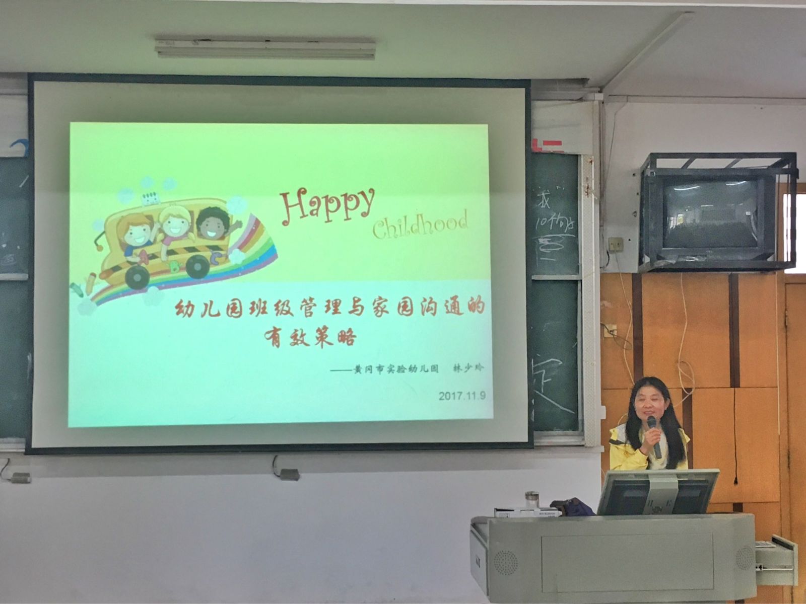 2017年11月9日14时教育科学与技术公司学前教育专业2015级全体同学于在博学楼B02教室,召开关于《幼儿园班级管理与家园沟通的有效策略》专题讲座。黄冈市实验幼儿园西湖三路园区林少玲园长为本次讲座主讲人,讲座围绕班级管理与家园沟通的关系、幼儿园班级管理策略、家园沟通策略三个部分展开,从理论到实践生动形象阐述了幼儿园班级管理与家园沟通间的关系。林少玲园长亲切耐心的讲解,获得全体同学的一致好评。