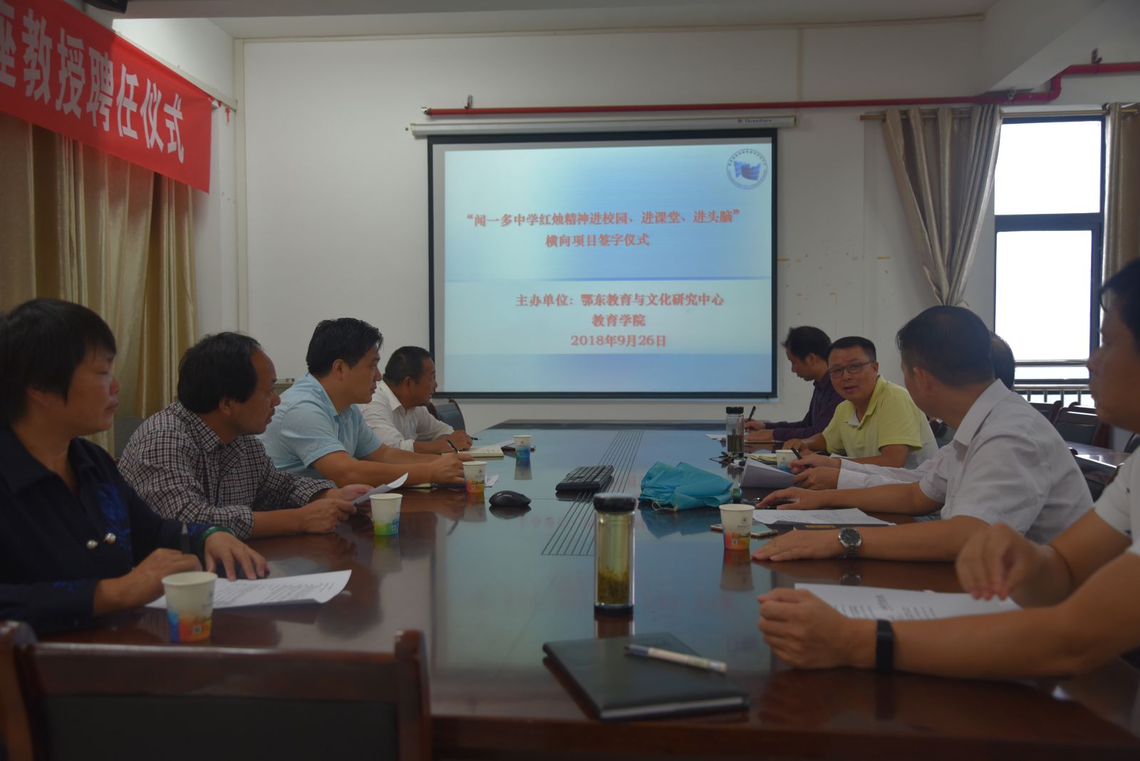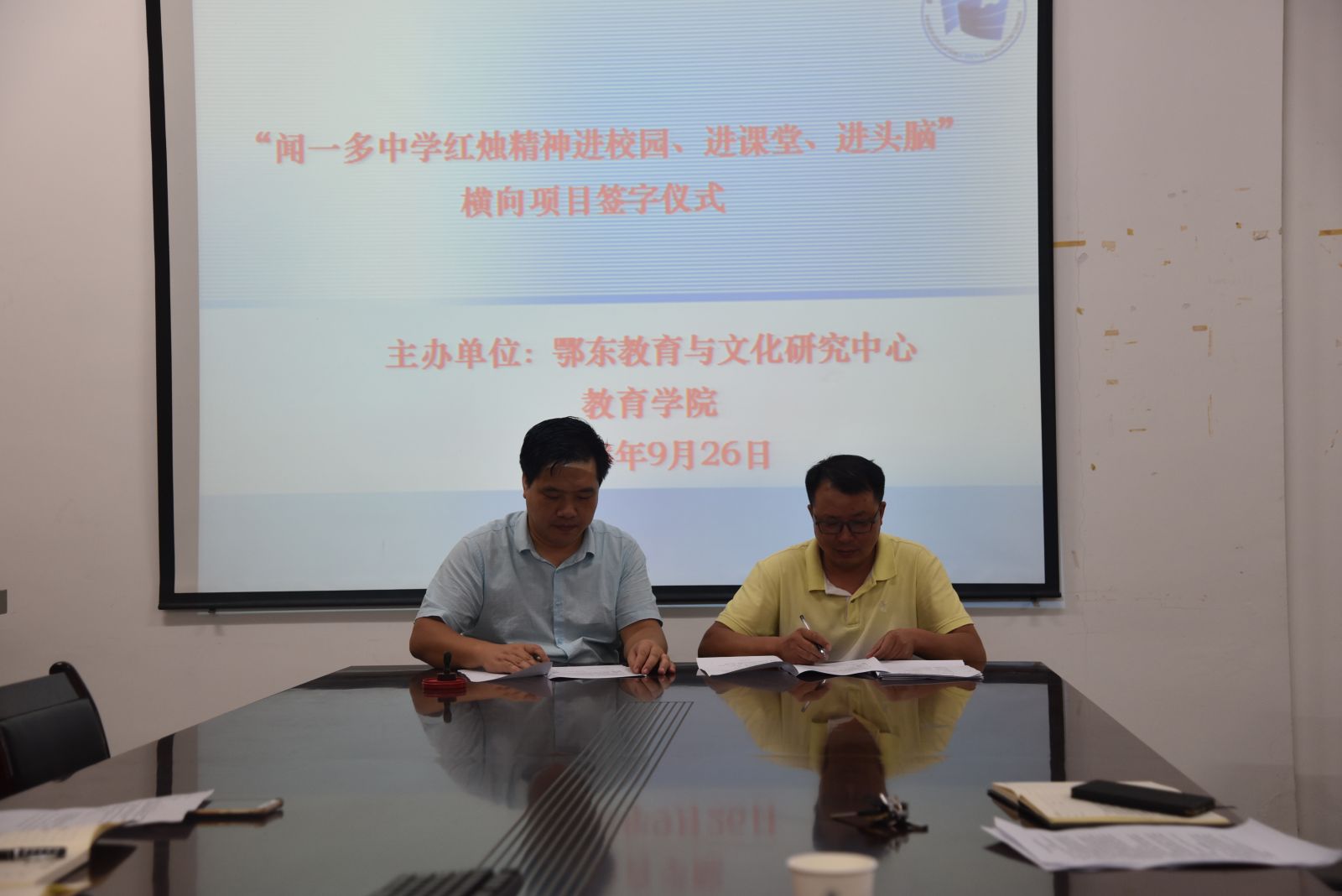 9月26日,williamhill威廉希尔官网与浠水闻一多中学在williamhill威廉希尔官网会议室举行“红烛精神进校园、进课堂、进头脑”行动研究横向项目签字仪式。签字仪式由williamhill威廉希尔官网总支书记林永希教授主持,浠水闻一多中学郑细林董事长等4位嘉宾,教科院领导班子成员、鄂东教育与文化研究中心部分教师参加仪式。