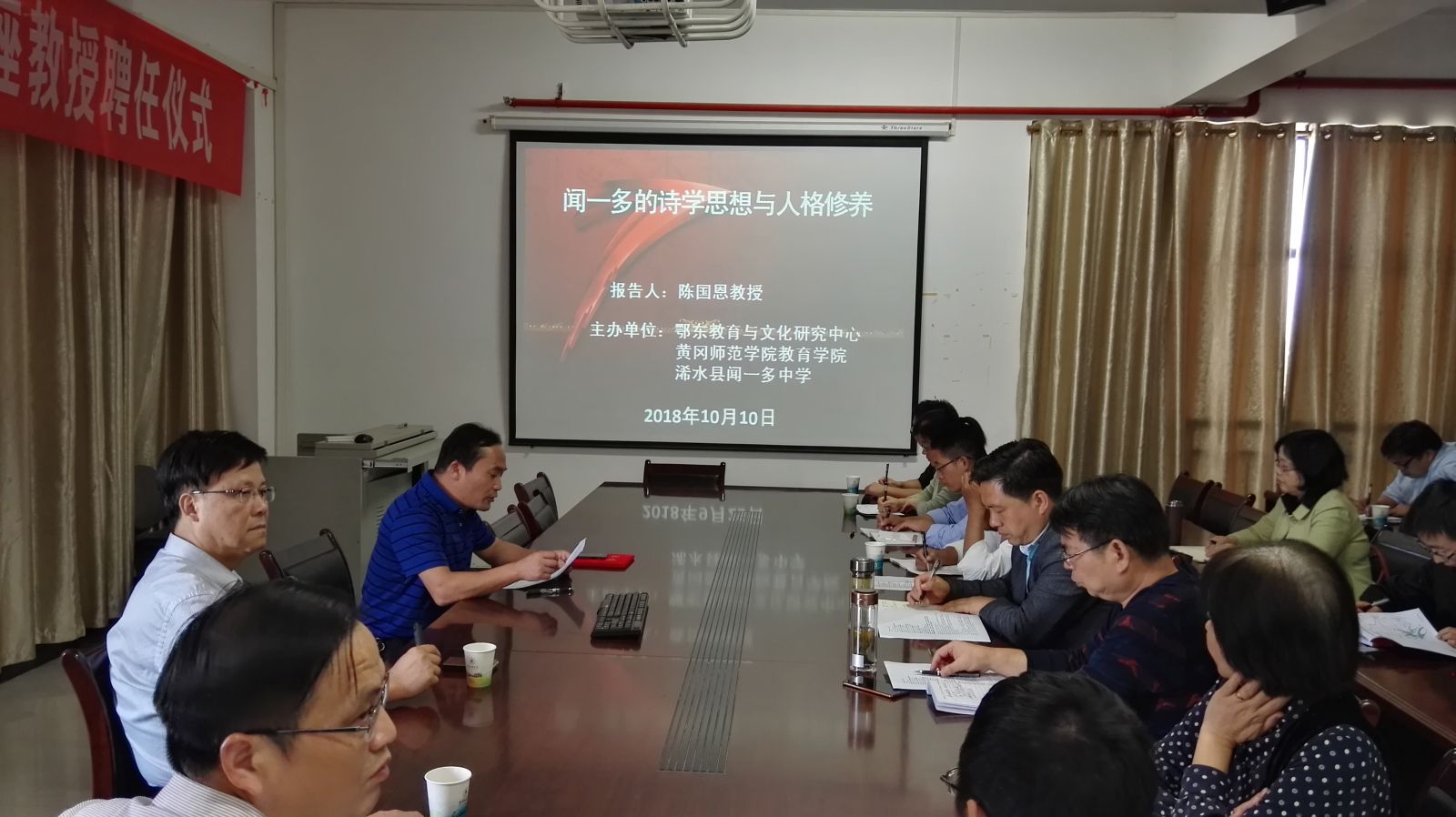 10月10日,“红烛文化进教材、进课堂、进头脑行动研究”学术研讨会在公司召开。中国闻一多研究会会长、武汉大学文公司教授、博士生导师陈国恩先生,浠水县巴河镇詹丰鸣,闻一多中学党总支书记程宝铭、董事长郑细林等出席研讨会。