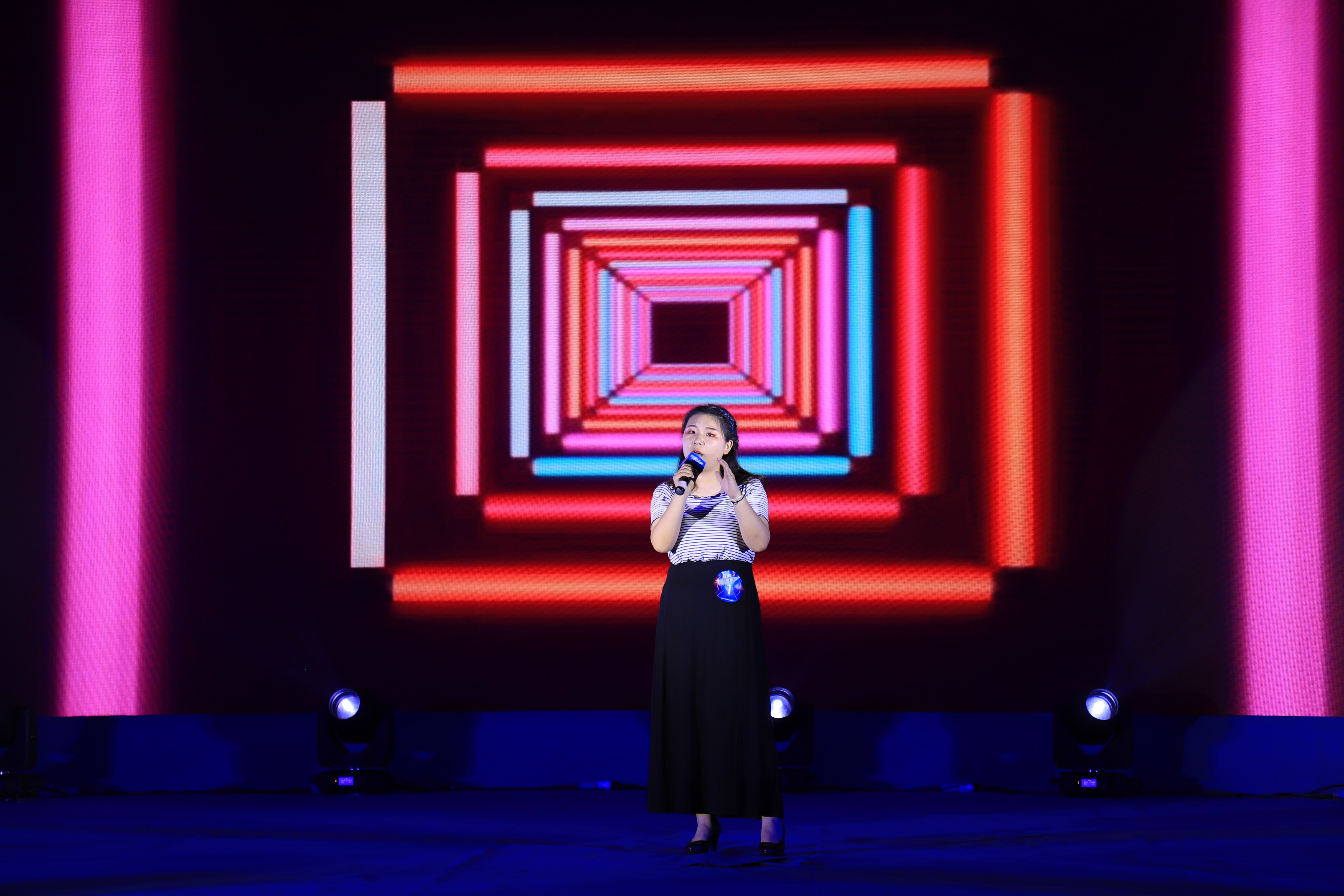 赛前的开场热舞瞬间点燃了比赛氛围,接着主持人提醒比赛选手做好上场准备,并与现场观众互动缓解选手上台压力。在大家的期待中第一轮12进6比赛正式开始,公司1号选手刘佳颖带来歌曲《血腥爱情故事》,公司11号选手韩虔也顶住压力带来一首《红玫瑰》,一轮比赛在随后的舞蹈中结束。接着主持人上台宣布前六名晋级选手名单,公司两位选手都顺利晋级。