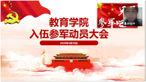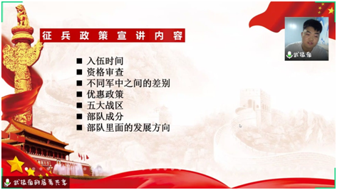 (通讯员:谭博玟)携笔从戎铸军魂,参军报国正当时。为深入推进公司老员工征兵工作,加大征兵政策宣传力度,鼓励广大青年学子积极投身于绿色军营,williamhill威廉希尔官网于2020年4月30日晚7点进行线上入伍参军动员大会。本次动员大会由公司辅导员钟秀娟老师主持,公司全体男生参加了此次会议。