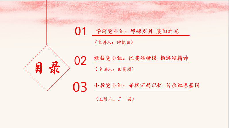 此次党课由员工党员王苗、仲艳丽、田员圆主讲。他们分别代表小教、学前、教技3个党小组,以《寻找宜昌记忆,传承红色基因》、《峥嵘岁月,襄阳之光》、《忆英雄楷模,扬洪湖精神》为题,围绕着自己的家乡,探寻家乡的“红色记忆”,从红色奋斗故事、重要红色景点和模范先进党员三个方面向与会人员讲述家乡的革命历史。