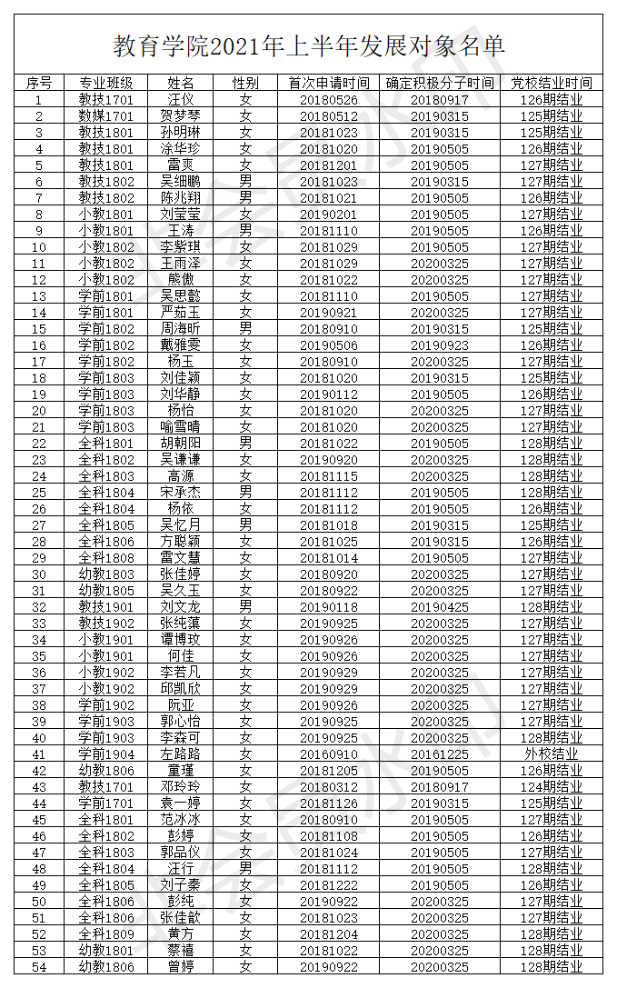 根据公司《关于做好2021年上半年发展对象确定和备案工作的通知》文件要求,经审查,公司汪仪等55名入党积极分子初步符合组织发展要求。具体名单如下: