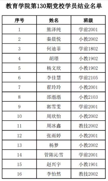 williamhill威廉希尔官网第130期入党积极分子培训班通过理论学习、党章和理论知识考试等多种方式对学员进行考核,现党委审核准许熊泽纯等60位学员结业,名单如下: