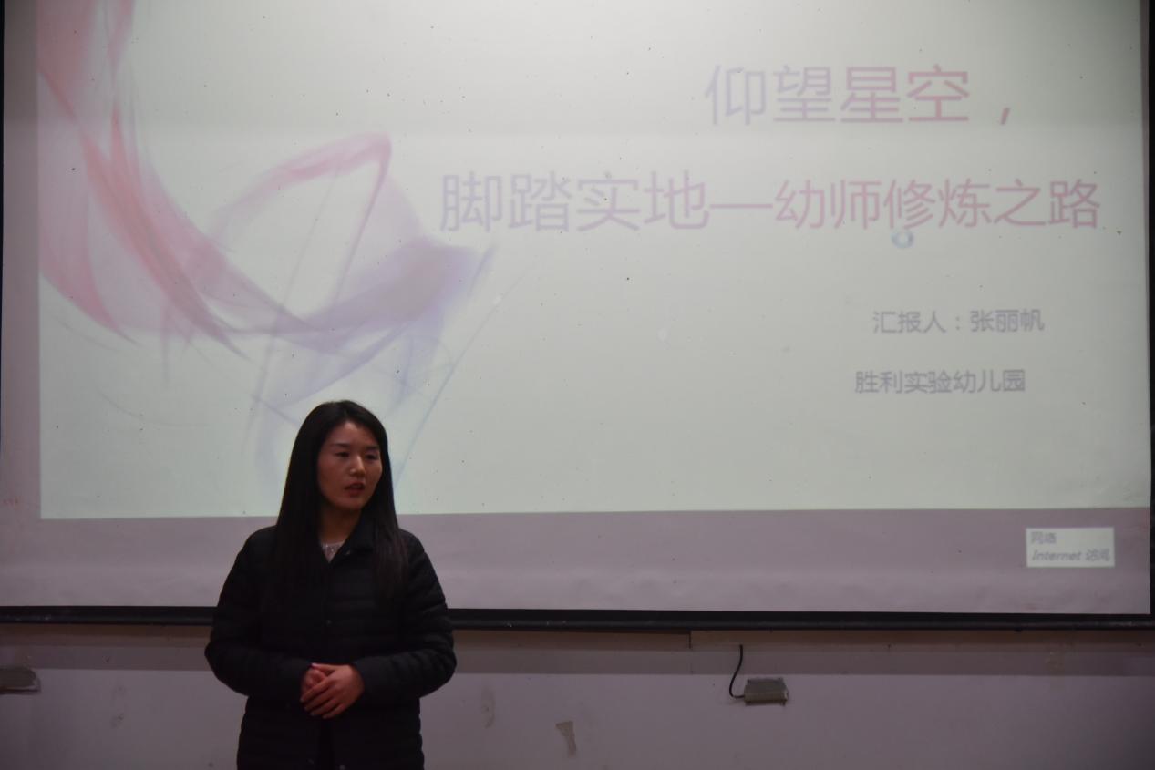 本次讲座的主题是“仰望星空,脚踏实地——幼师修炼之路”。张丽帆老师首先分享自己在大学的经历感受以及从事一线教师的教学经验,提到学习学前教育理论知识对自己的实践工作非常有帮助,也更加认同教师这个职业。