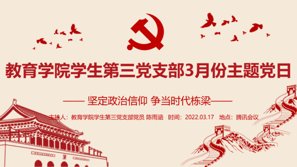 3月17日下午14:00,williamhill威廉希尔官网员工第三党支部在腾讯会议线上开展三月份主题党日活动,此次活动主题为“坚定政治信仰,争当时代栋梁”,员工第三党支部书记邹焱萍老师,组织委员宋国柱老师出席本次会议,员工第三党支部全体员工党员参加,本次会议由员工党员陈雨涵主持。