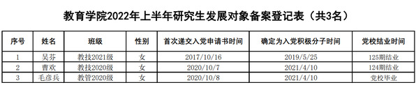 根据公司《关于做好2022年上半年发展对象确定和备案工作的通知》文件要求,员工党支部广泛征求班级群众座谈意见、班主任意见、辅导员意见,公司活动参与情况,吴芬等3名入党积极分子初步符合组织发展要求,经员工支部讨论推荐,报公司党委备案审批同意,具体名单如下: