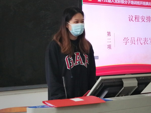 会上,学员代表沈晗代表全体培训班学员做出承诺,端正学习态度,积极主动地参与学习;提高自己的思想觉悟,不断完善自己;把政治追求和实际行动有机统一起来, 以一名党员的标准严格要求自己,树立良好的形象,作同学们的榜样,促进大家共同进步。