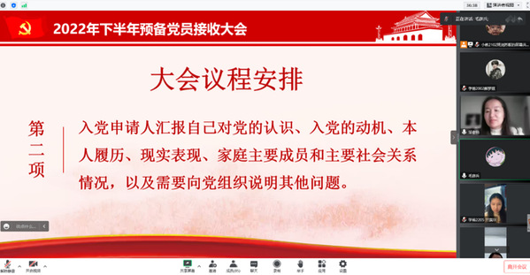 11月13日晚19:00,williamhill威廉希尔官网研究生党支部在腾讯会议召开2022年下半年预备党员接收大会。公司党委副书记王永胜、员工第三党支部书记邹焱萍、研究生党支部书记韦耀阳、支委余杏琪及李坤艳出席会议,研究生党支部员工党员及发展对象毛彦兵参加会议。本次会议由员工第三党支部书记邹焱萍主持。