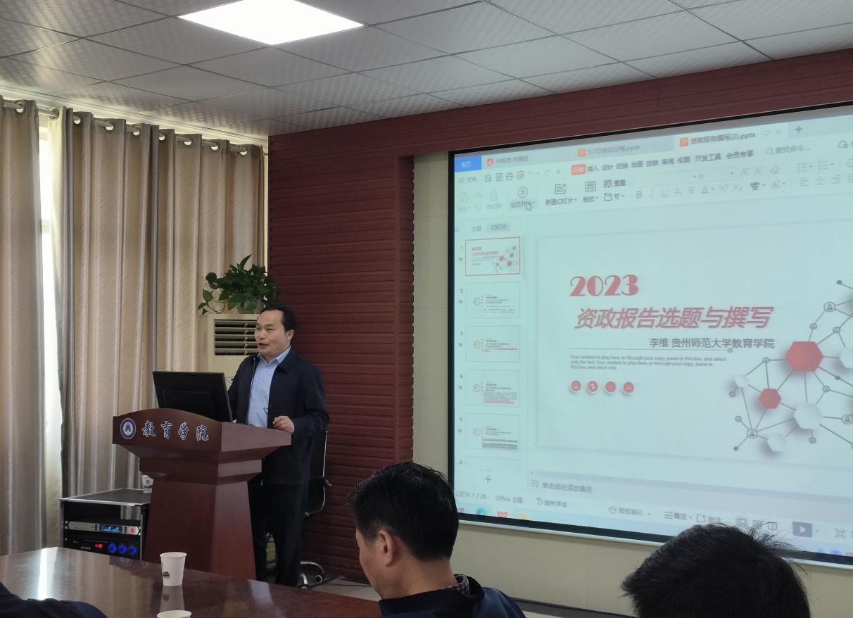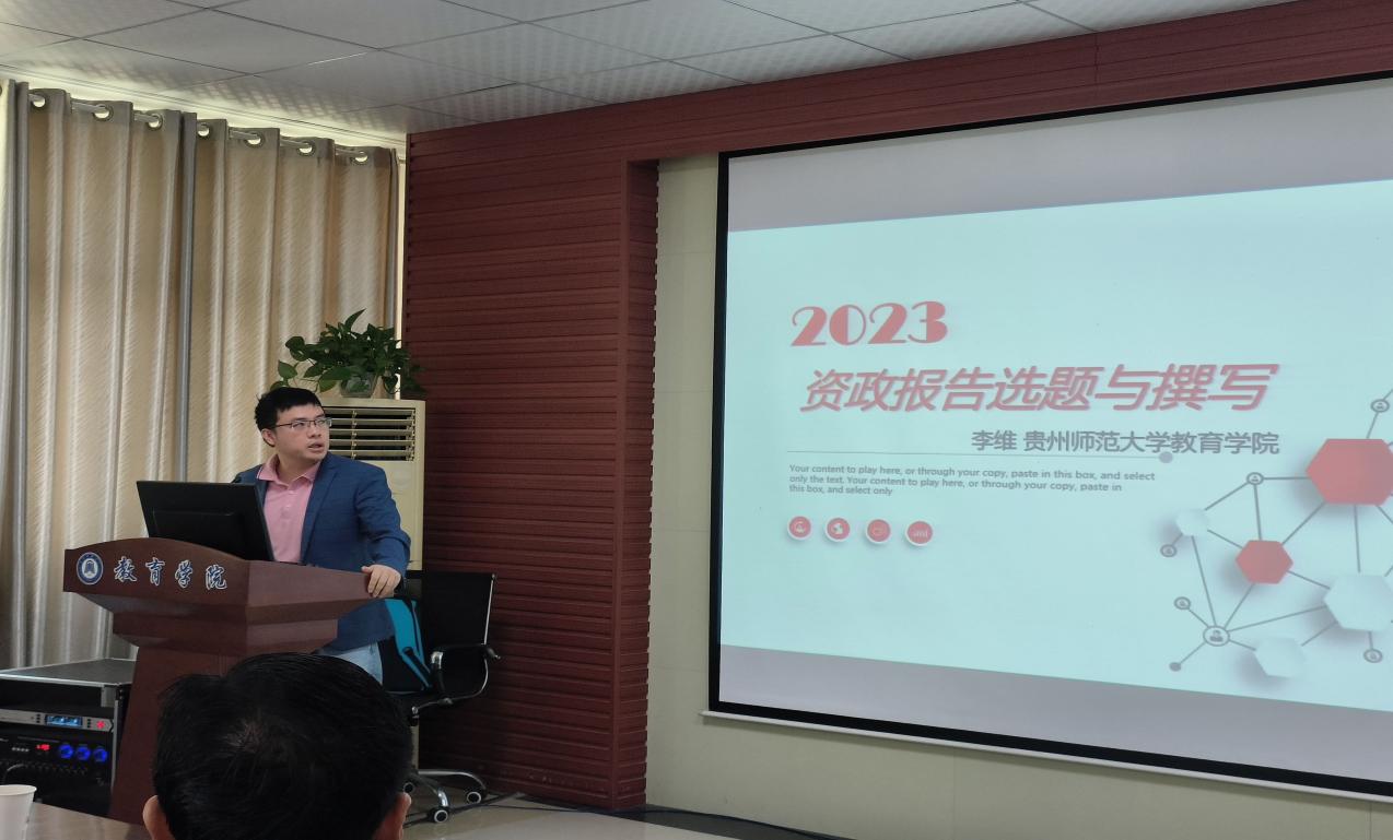 上午的论坛由陈经理主持,他首先代表全院师生向各位学者的到来表示衷心的欢迎和感谢。随后,贵州师范大学williamhill威廉希尔官网副教授、厦门大学教育学博士后李维老师做了题为《强化问题导向,写好资政报告》的分享,在报告中,他分别从资政报告的选题、分类、结构格式、提交渠道等方面进行了深入展开,强调了资政报告的针对性、真实性和时效性。在互动环节中,陈经理和韦耀阳老师从自身科研实践中提出相应问题,与李维老师进行了一场深刻的学术探讨。