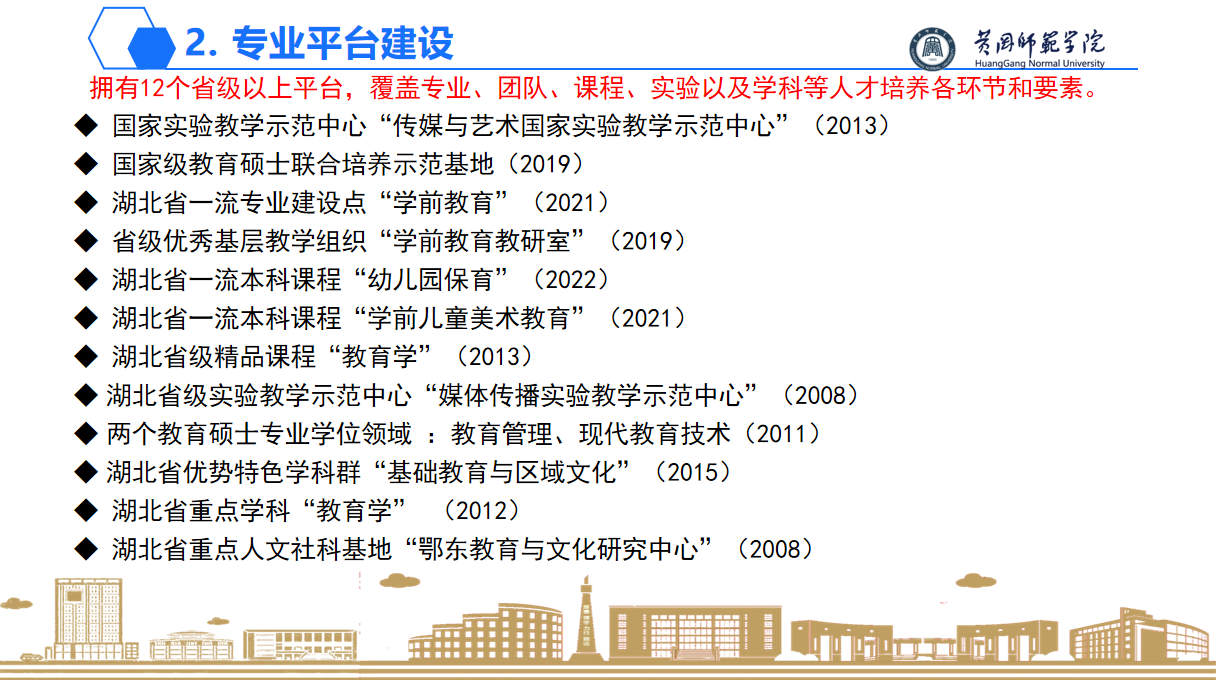 1、学前教育专业发展历程:williamhill中文官网学前教育专业办学历史悠久,1997年公司开办幼儿师范专业,1998年公司与麻城师范联合开办五年制学前教育专科。2008年成功申报学前教育本科,是湖北省较早成立的学前教育本科专业之一。历经15年的专业建设,已成为省级一流本科专业建设点,“学前教育教研室”获批湖北省优秀基层教学组织,拥有省级一流本科课程3。同时本专业拥有12个省级以上平台,覆盖专业、团队、课程、实验以及学科等人才培养各环节。