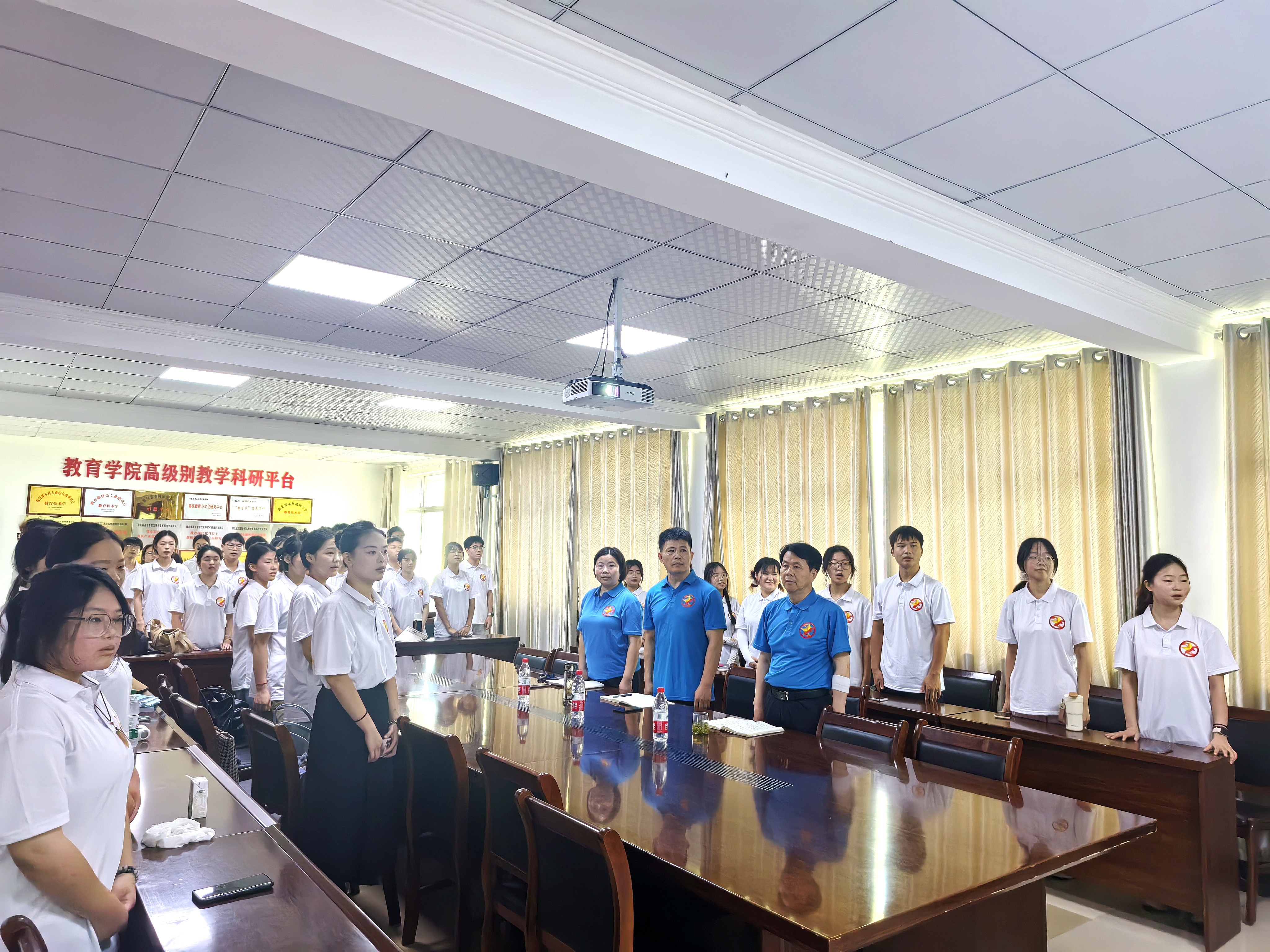 第五项:党委书记讲话并宣布出征。党委书记钟劲松指出,繁星团队50名成员从300名报名者中被挑选出来,即将为700余名乡村小员工进行半个月的服务,综合天气、食宿等因素,大家一要做好吃苦的准备,二要高度重视并切实保障自身安全。他强调,工作中,大家一要注重进行积极的教育引导,保证教育的建设性、延续性;二要注重进行全面的教育启发,开拓孩子们的胸襟、眼界、视野和创造力;三要注重进行深刻的自我教育,了解国情民情,厚植教育情怀,把握教育规律,历练提升师德、师智、师能。他鼓励团队成员们在乡村教育的实践中提升自我,实现个人与员工的共同成长。