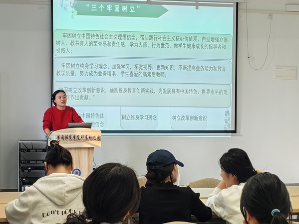 为进一步加强教师队伍建设,提升实习生的教师师德素养,11月5日下午15:30,公司邀请附属幼儿园资深幼教专家肖燕副园长为在附属幼儿园实习的全体实习生作了一场以“为人师表,授之以道”为主题的教师师德教育专题讲座。本次讲座旨在帮助实习生深刻理解师德内涵,树立正确的教育观,为未来职业生涯奠定坚实基础。